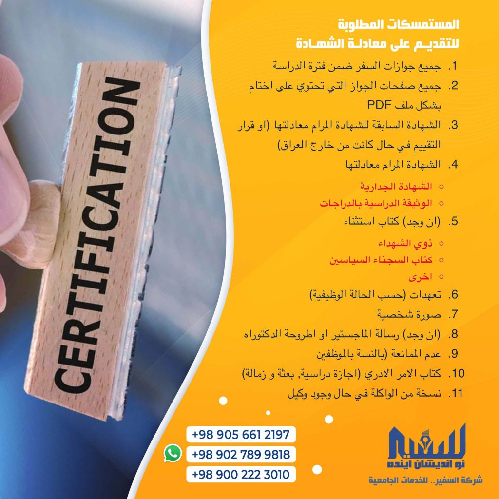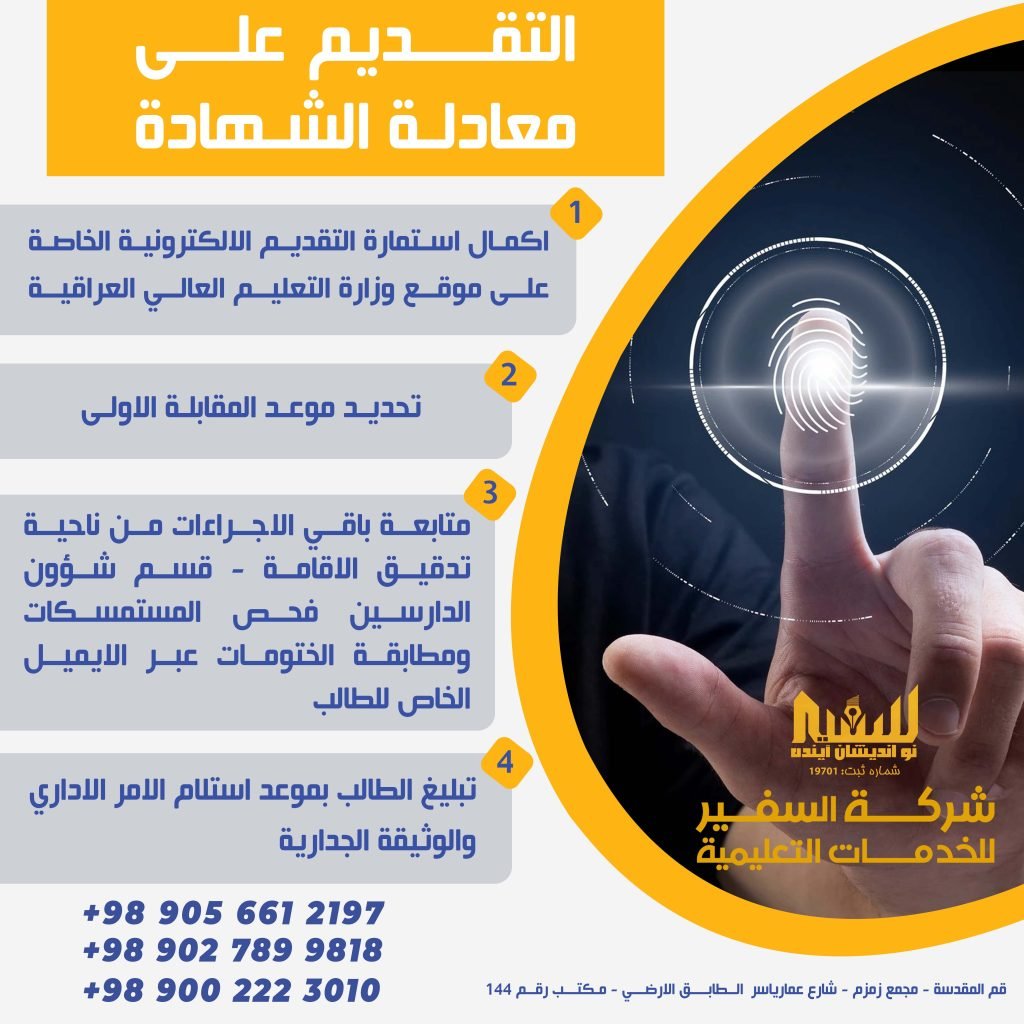 اعلان.. تقدم لكم شركة السفير “سفیر نو اندیشان آینده” خدمة التقديم على موقع وزارة التعليم العالي العراقية من اجل معادلة الشهادات للطلاب الحاصلين على الشهادات للدراسات العليا خارج العراق الراغبين بمعادلة شهاداتهم في العراق