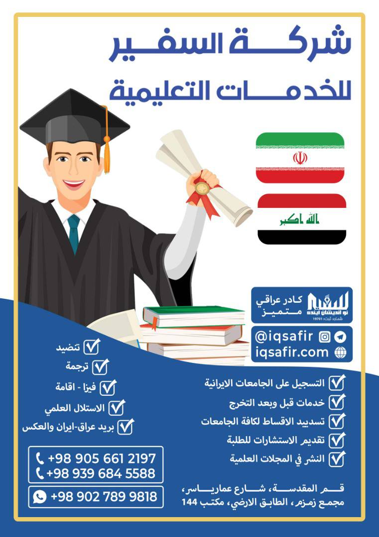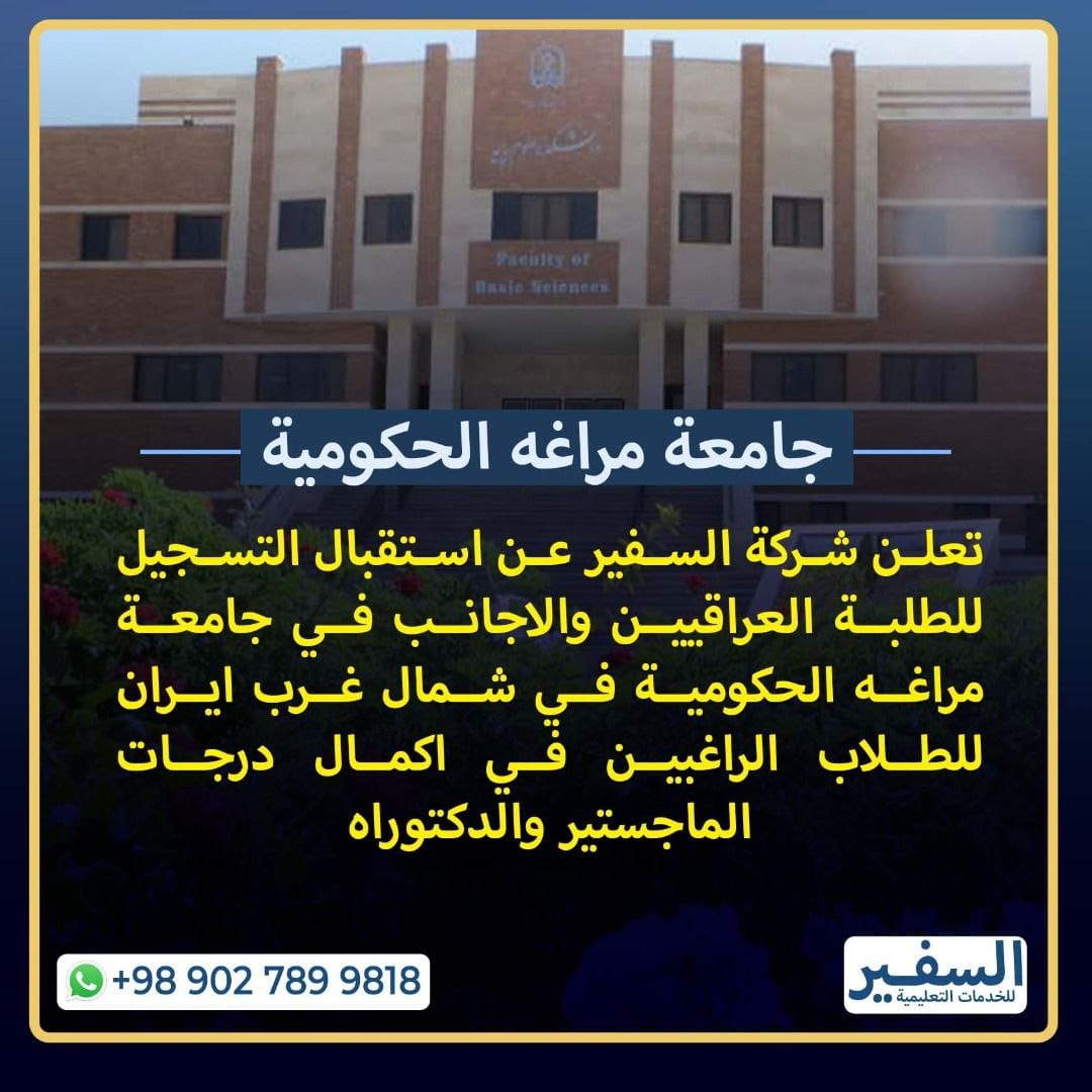تعلن شركة السفير عن استقبال التسجيل للطلبة العراقيين والاجانب في جامعة مراغه الحكومية في شمال غرب ايران للطلاب الراغبين في اكمال درجات الماجستير والدكتوراه