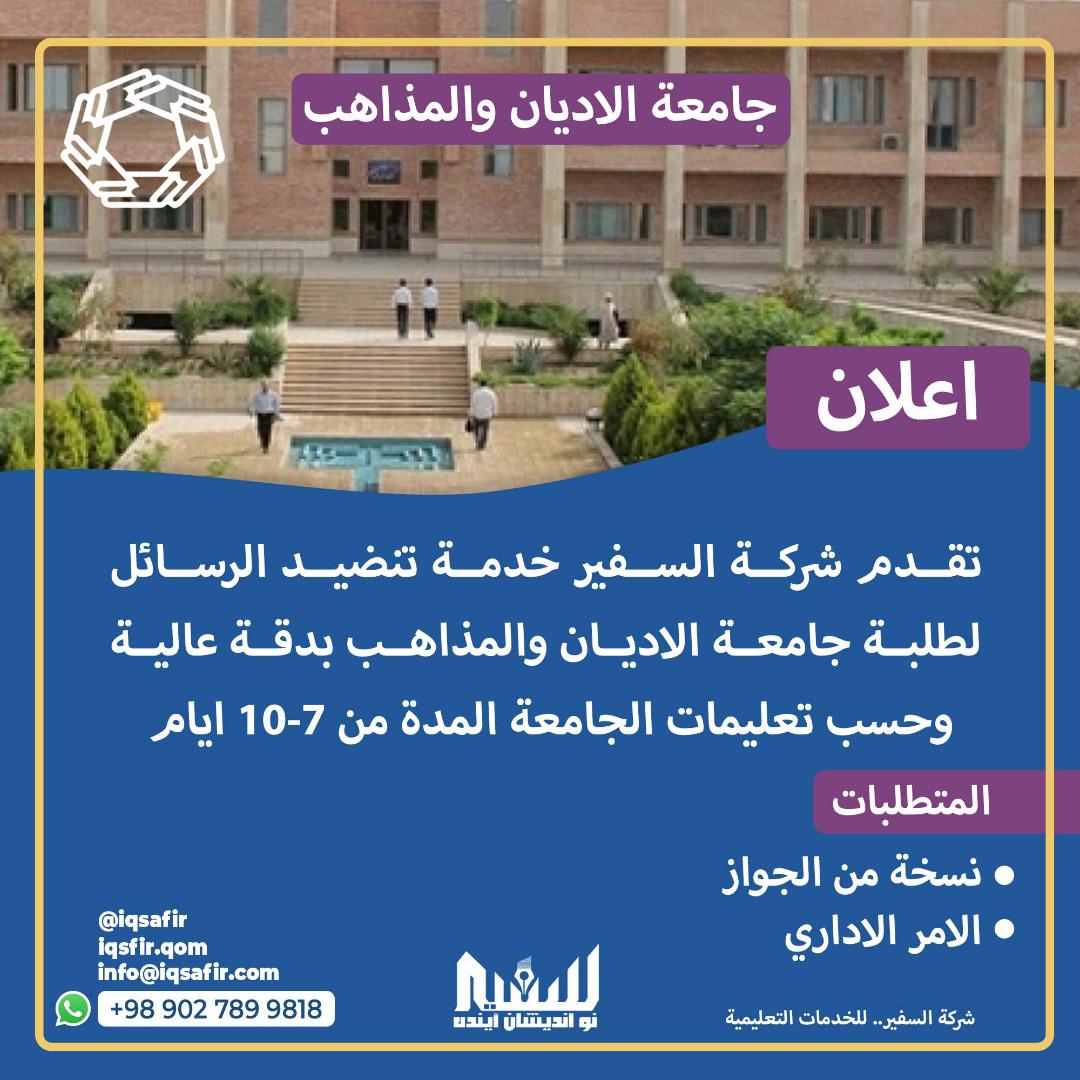 السابق - تعلن لكم شركة السفير عن تقديم خدمة تنضيد الرسائل لطلبة جامعة الاديان والمذاهب بدقة عالية وحسب تعليمات الجامعة.