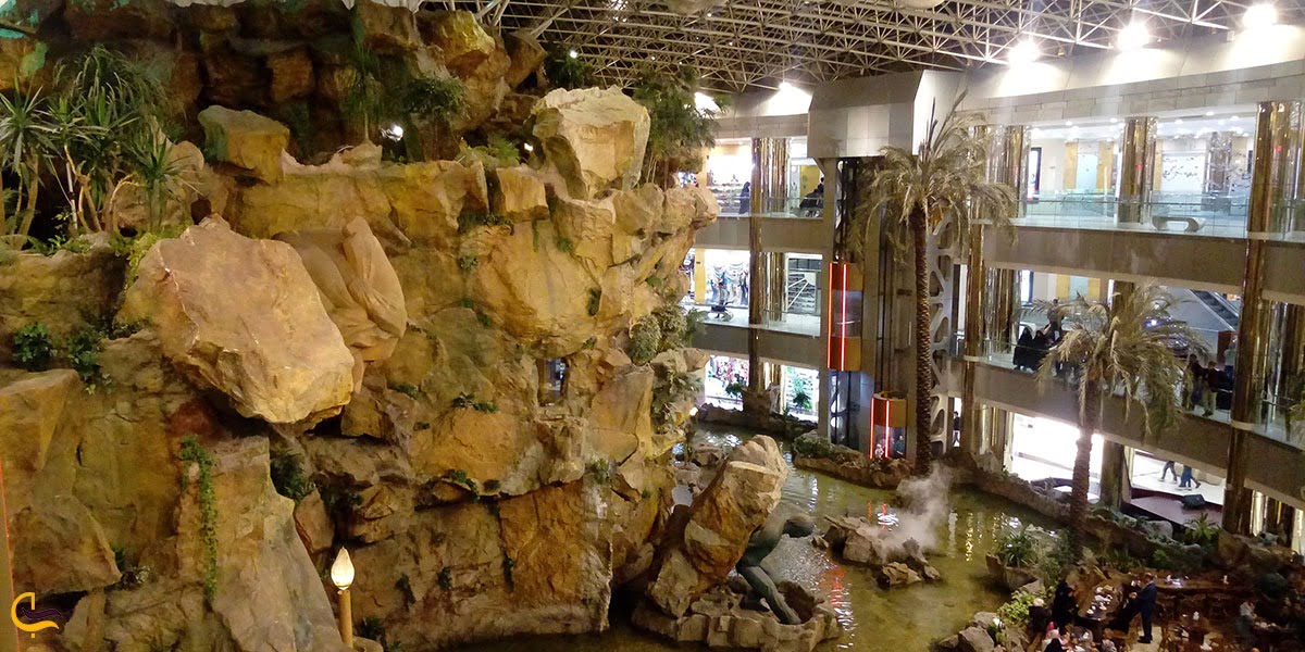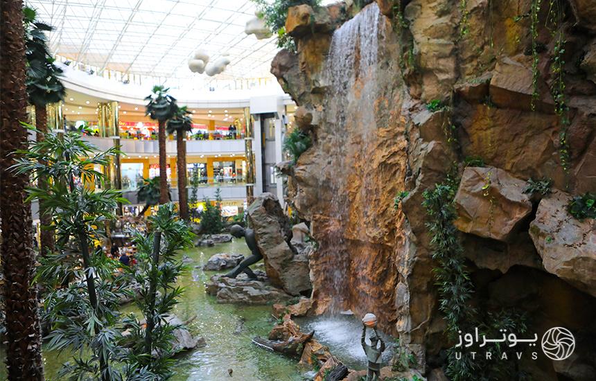 من المثير للاهتمام معرفة أن هذا المنتجع الكبير والجميل يمثل بشكل عام رمزًا للصخور والسحابة والشلال والمطر وطبيعة البركة. في هذا الجزء تظهر السحب مع المطر نزول الرحمة الإلهية ويتم تكوين الهواء الرطب في بيئة المنتجع حتى يتمكن الناس من تجربة الشعور بالطبيعة الحقيقية في مجمع أرمان التجاري. في خضم هذا يمكن رؤية فتاة صغيرة كما لو كانت تحمل ضوءًا فوق رأسها، وهو رمز لحركة الإنسان نحو الضوء والسطوع. يبلغ ارتفاع الشلال الرئيسي بالمنتجع 14 مترًا وعرضه 6 أمتار ، وبجانب هذا الشلال الضخم 11 شلالًا صغيرًا آخر يتدفق بجوار الصخور ويد التمثال.