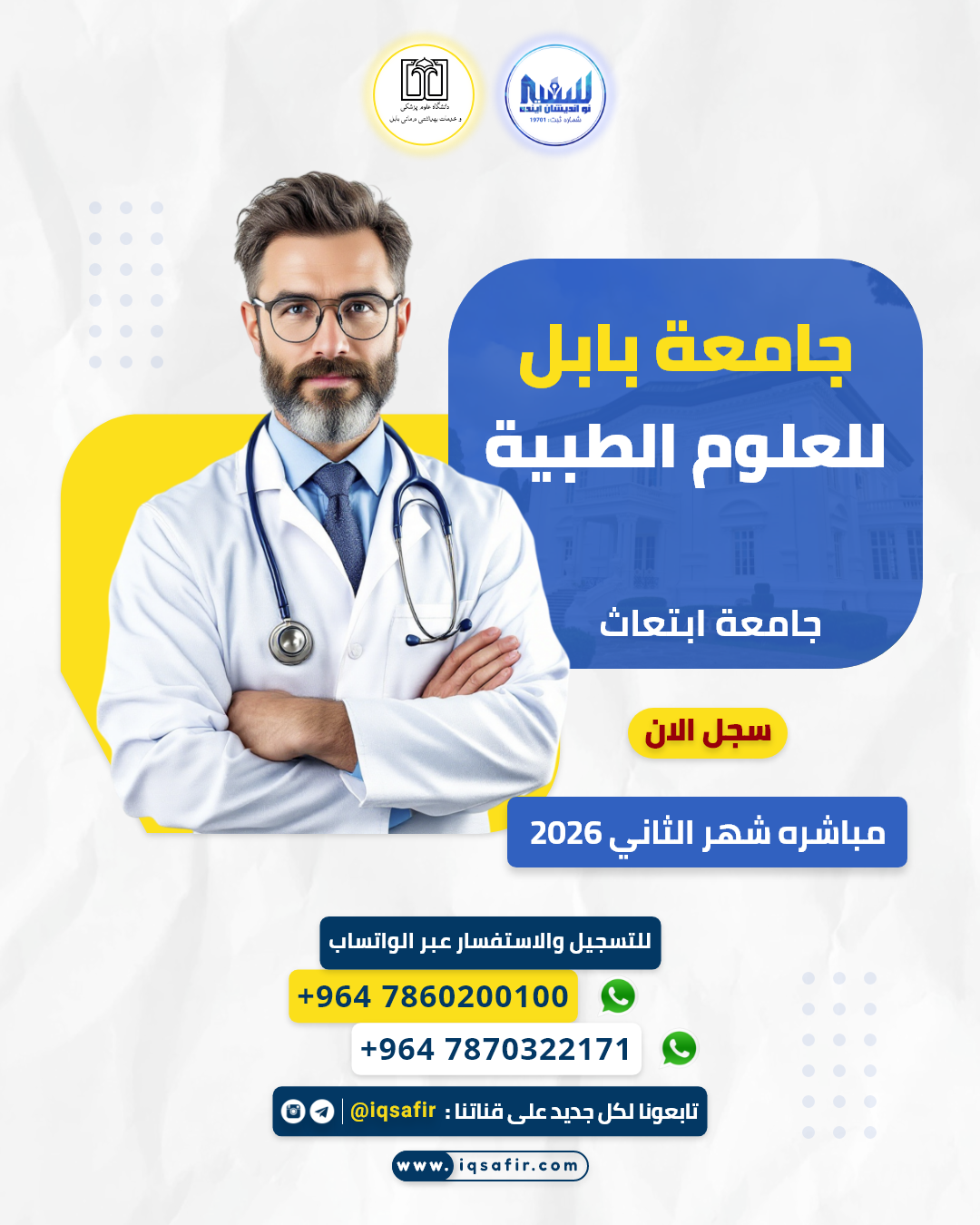 جامعة بابل الطبية – الفصل الثاني 2026 ضمن جامعات الابتعاث والمباشرة الرسميةتعلن شركة السفير عن فتح باب التقديم على التخصصات الطبية والصحية التالية:━━━━━━━━━━━━━━━🎓 برامج الماجستير – Master’s Programs(تُدرس باللغة الإنكليزية)🩺 اختصاصات التمريض:1️⃣ تمريض...
