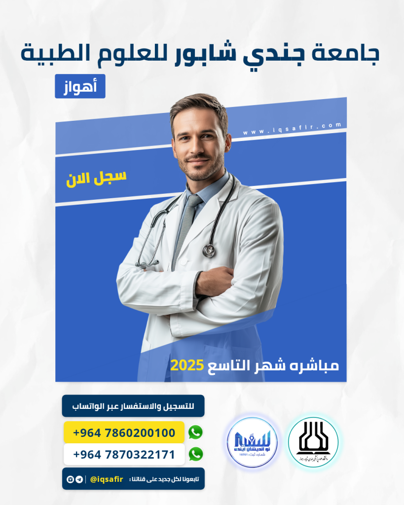تتوفر قبولات محدودة للتخصصات الطبية البکالویوس، ماجستیر والدکتوراه على شهر التاسع لعام 2025م في جامعة جندي شابور الطبية في مدينة الاهواز سارع بالحجز قبل نفاذ المقاعد لكل التخصصات.