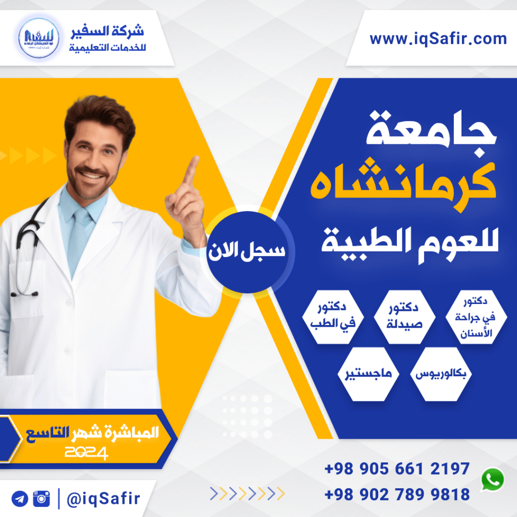 تعلن لكم شركة السفير للقبولات الجامعية عن استقبال التسجيل للطلبة العراقيين والأجانب في جامعة كرمانشاه الطبية ضمن جامعات النفقة الخاصة للطلبة الراغبین في اكمال الدراسات العلیا لدرجات البكالوريوس و الماجستير والدکتوراه، على كورس الشهر التاسع الميلادي من سنة 2024م