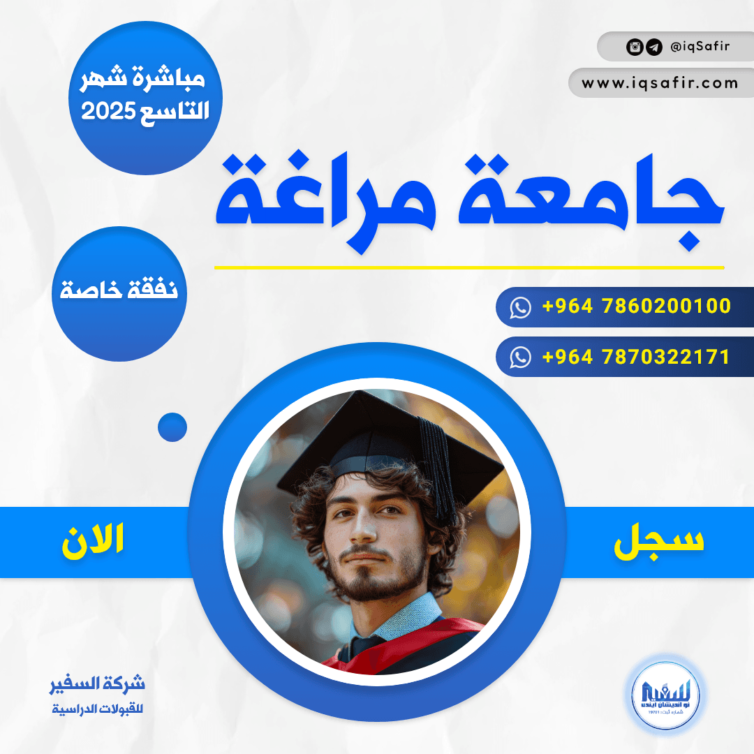 تعلن لكم شركة السفير للقبولات الدراسية عن فتح التسجيل على جامعة مراغة الحكومية والتي تعتبر ضمن جامعات النفقة الخاصة للماجستير والدكتوراه والمعترف بها ضمن دليل الجامعات المنشور على موقع وزارة التعليم العالي العراقية لعام 2025 حيث تكون المباشرة على شهر التاسع من هذه العام وتقع الجامعة في اقليم اذربيجان الشرقية .
