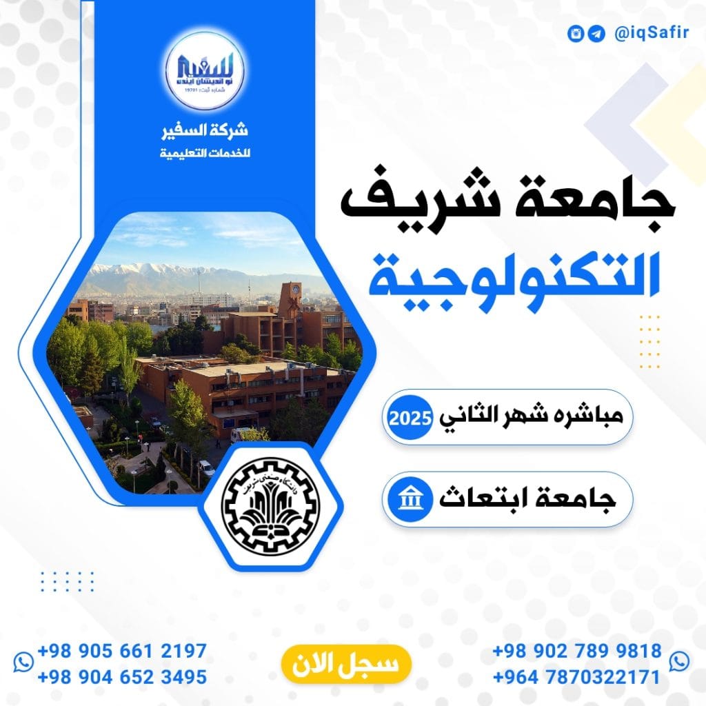 تعلن لكم شركة السفير للخدمات الجامعية في ايران عن فتح التسجيل على جامعة شريف التكنولوجية والتي تعتبر ضمن جامعات الابتعاث على شهر 2 من سنة 2025 للماجستير والدكتوراه البحثية .