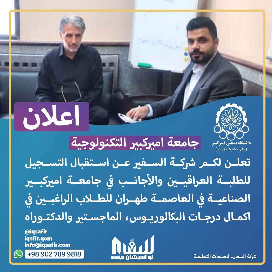 تعلن لكم شركة السفير عن استقبال التسجيل للطلبة العراقيين والأجانب في جامعة اميركبير الصناعية في العاصمة طهران للطلاب الراغبین في اكمال درجات البکالوریوس ،الماجستیر والدکتوراه.المستمسکات المطلوبة للتسجيل:1- صورة جوازة عالية الجودة. 2- صورة شخصیة خلفیة بیضاء عالیة...